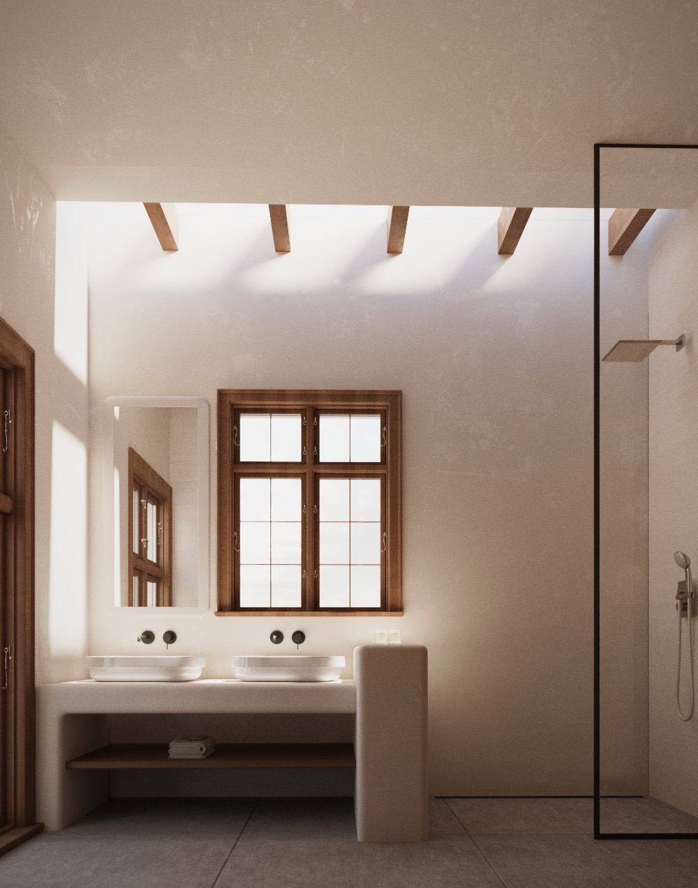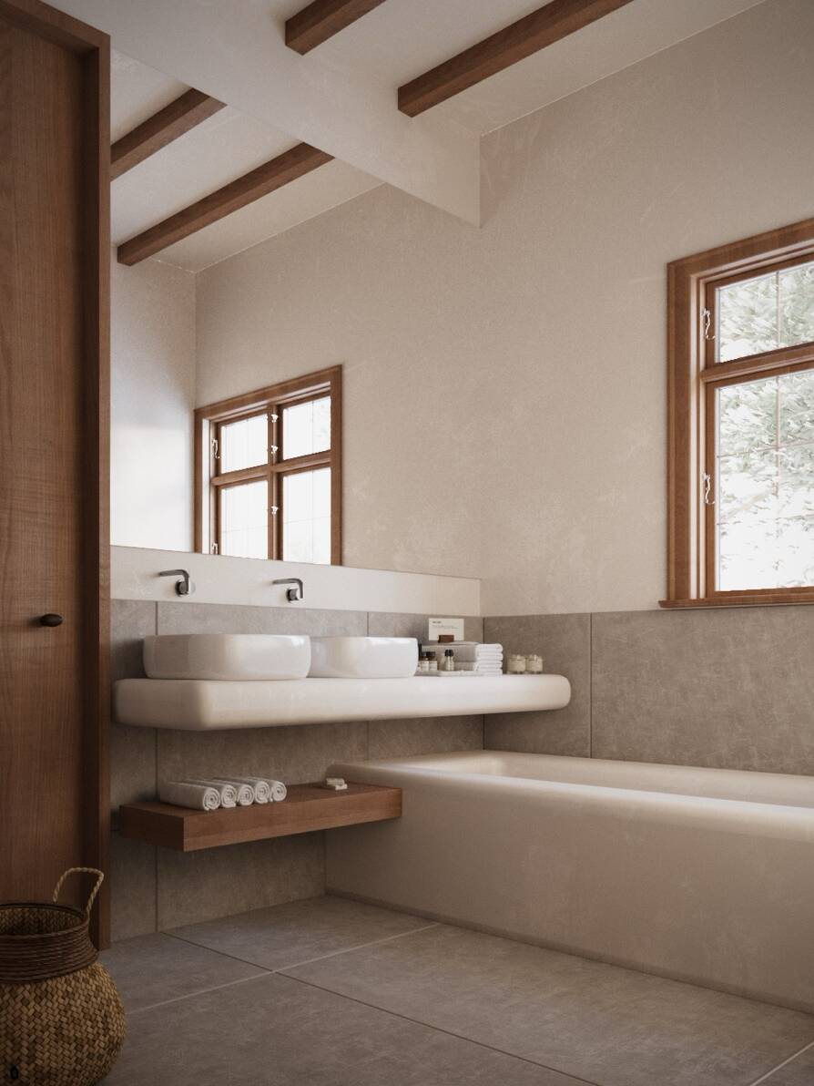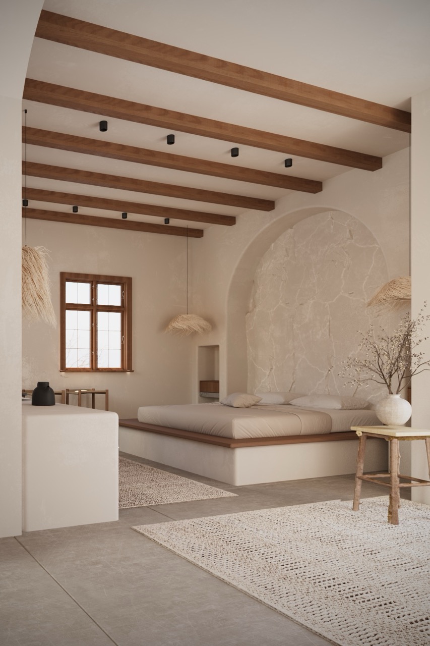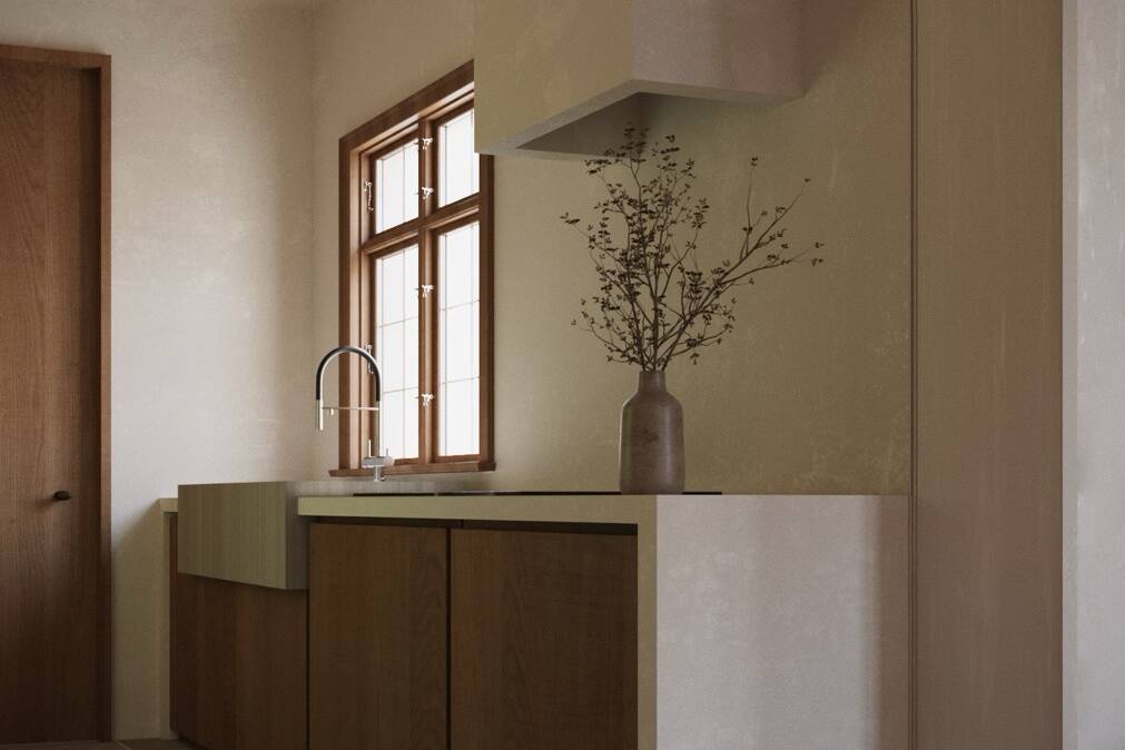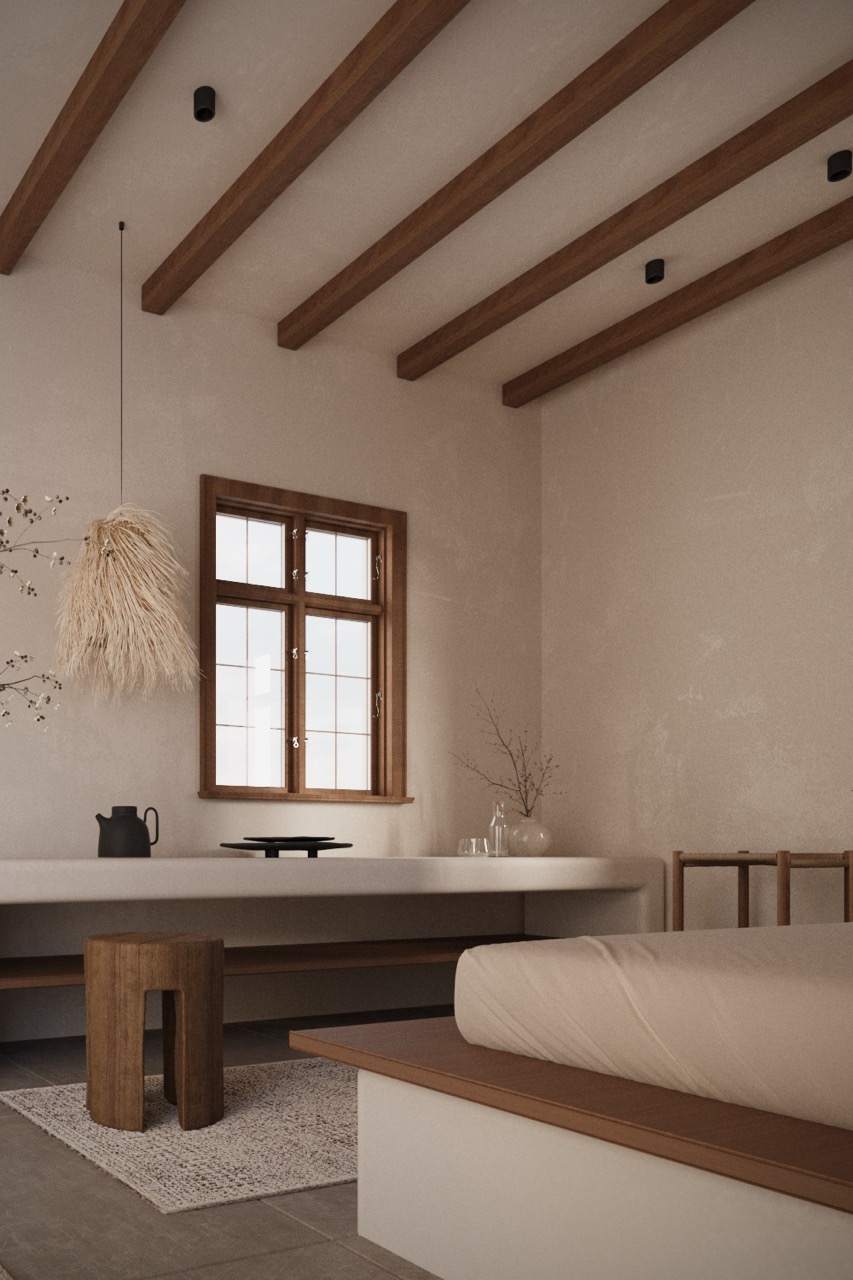 Materials remain close to the earth: lime plaster, warm wood, matte ceramics, and stone finishes form a palette that is cohesive, elemental, and honest. Ceiling beams and custom built-in furniture lend a crafted sensibility, with each surface thoughtfully resolved to create a subtle visual rhythm.