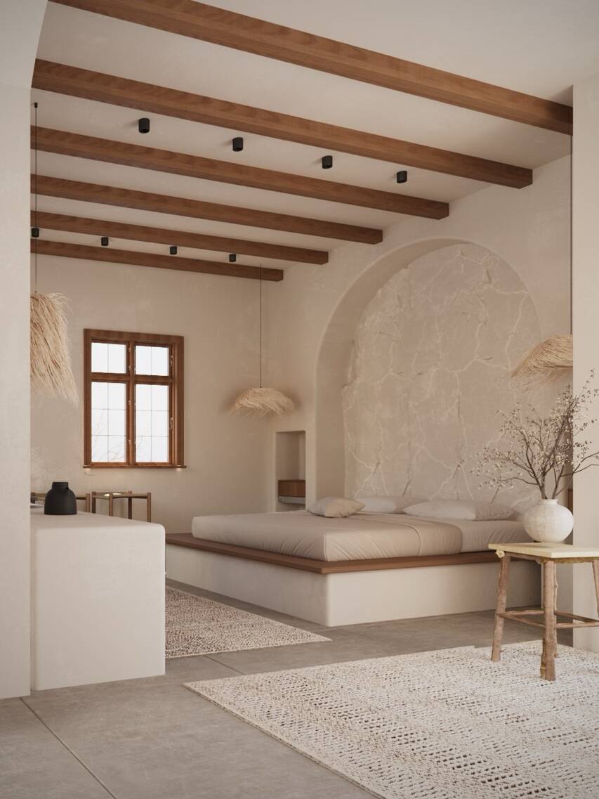 Aegean Shelter is a peaceful, grounded residence in Mykonos, shaped by natural textures, vaulted forms, and a soft, minimal palette. The house includes three bedrooms, two bathrooms, a living room, and a kitchen—all unified by light, rhythm, and handcrafted calm. A refined balance of tradition and modernity defines its intimate yet sculptural interior.