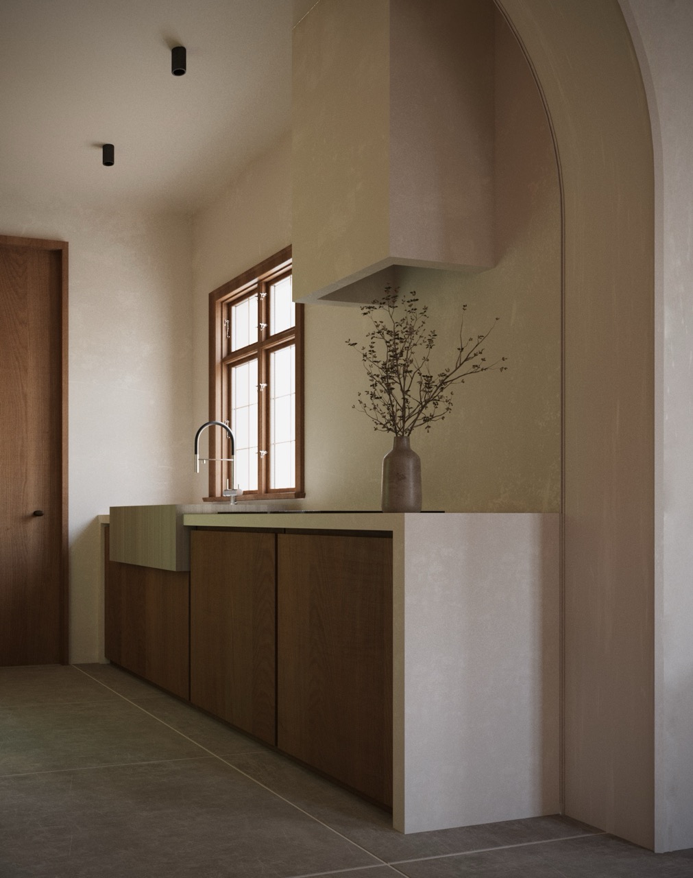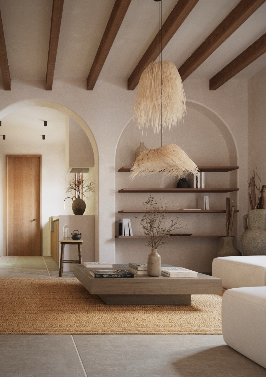 The layout includes three bedrooms, two bathrooms, a kitchen, and a living room. Arches are used as both structural and poetic devices, gently dividing functions while maintaining an open, flowing spatial continuity. Vaulted alcoves, soft corners, and integrated shelving create a layered sense of depth and comfort throughout the interior.