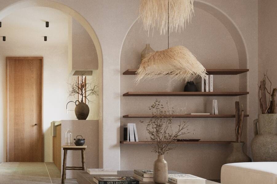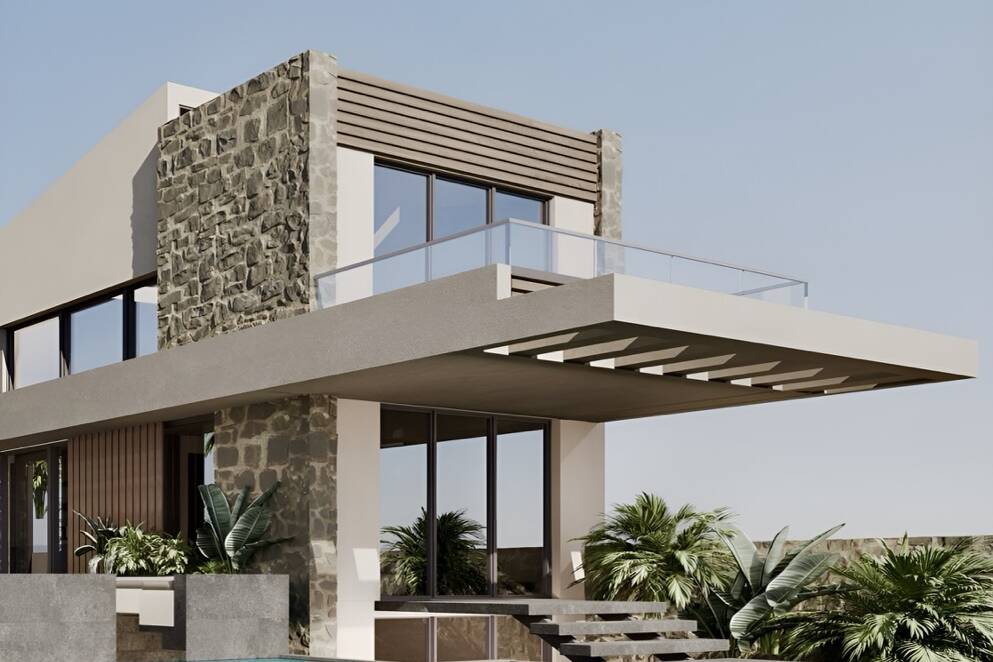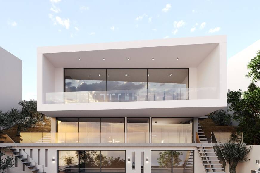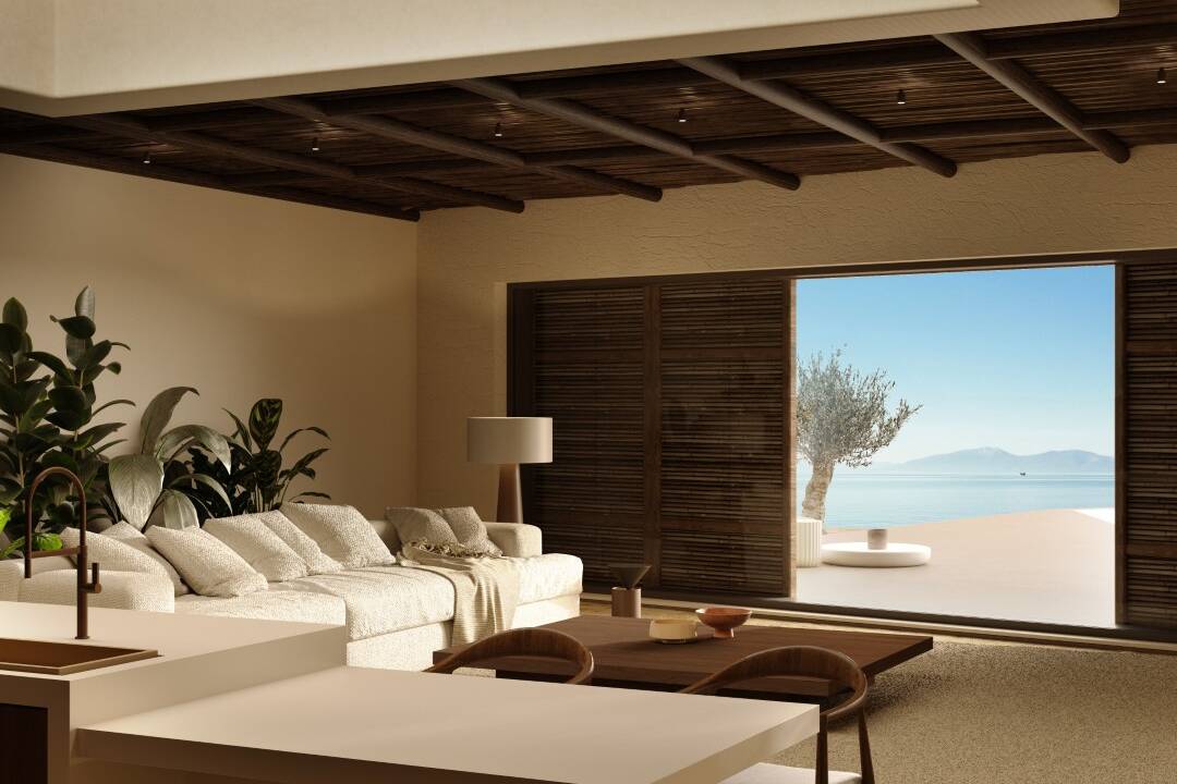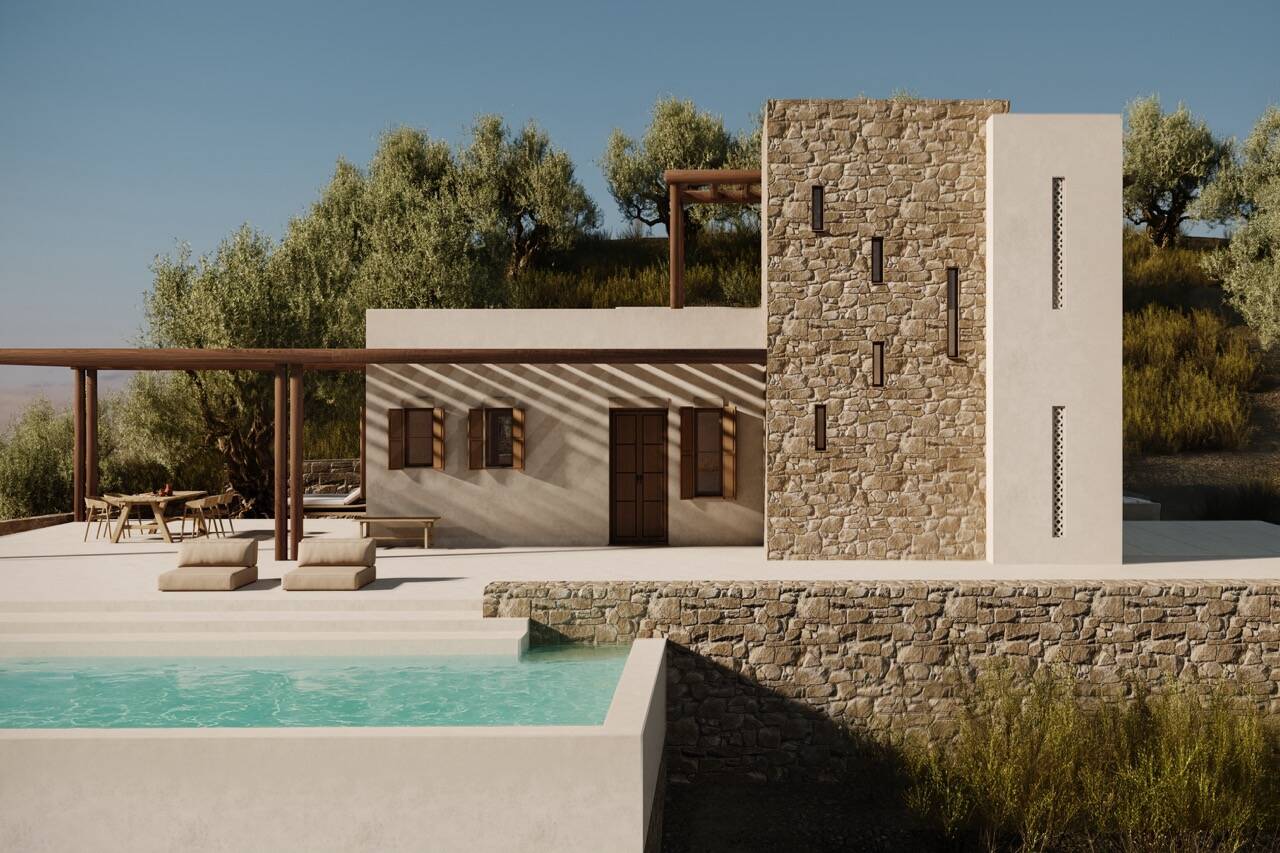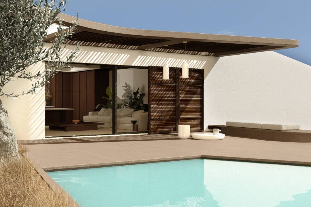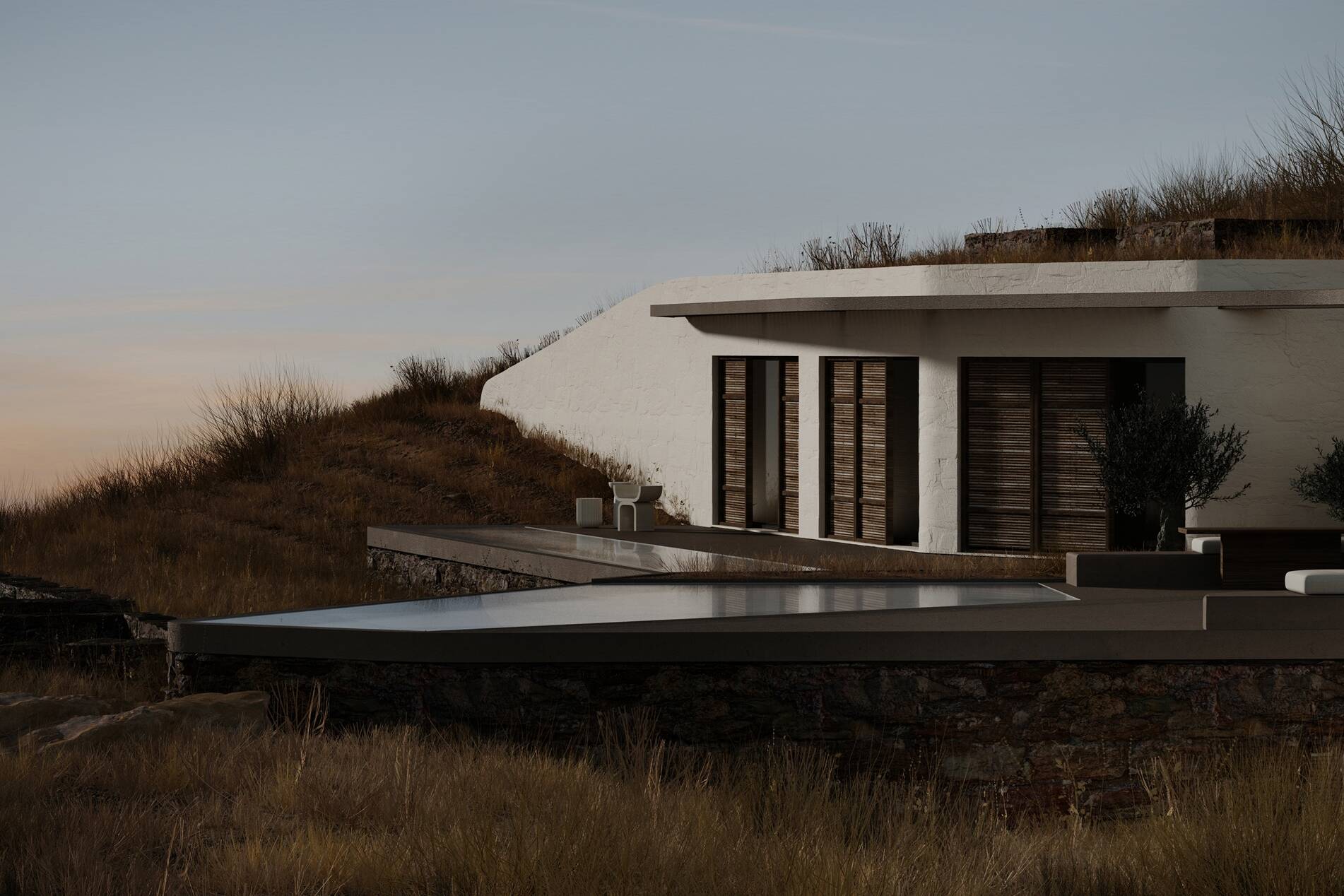 A modern take on Cycladic architecture, blending with Mykonos’ landscape. The design emphasizes minimalism, functionality, and integration with the environment. The houses are embedded in the hillside, with facades standing out, creating a timeless yet modern connection to nature.