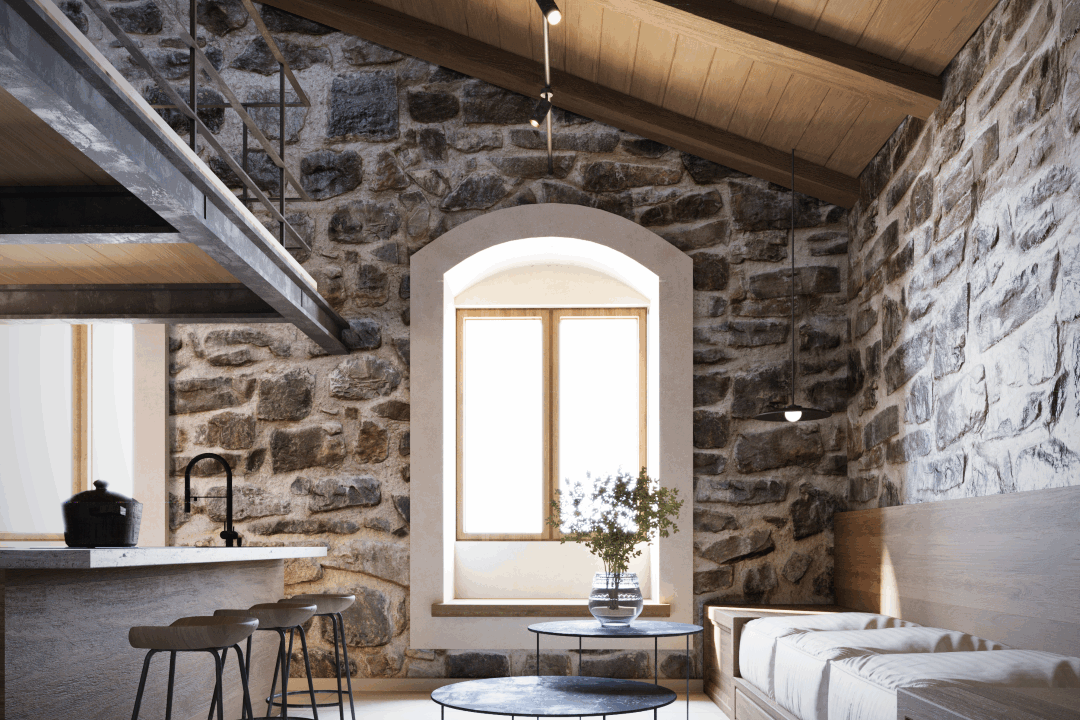 Traditional materials like stone and wood are used alongside modern elements, offering a rustic yet contemporary feel. Skylights and natural ventilation reduce energy use, while the structure’s organic form follows the hill’s curve.