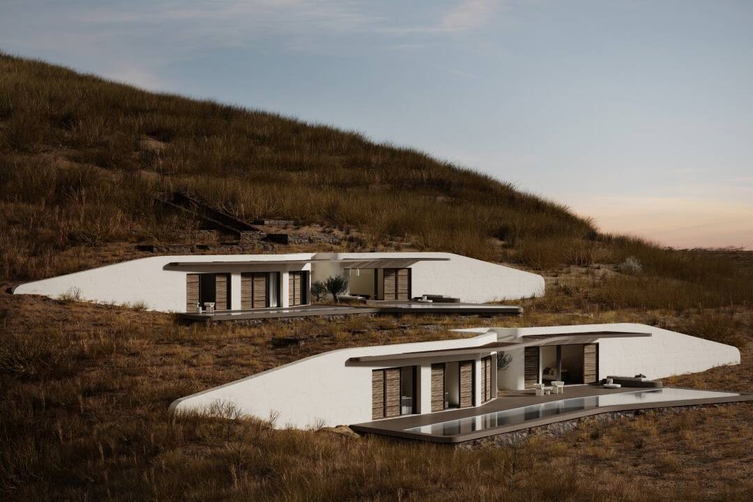 The complex combines robust materials—stone walls, mineral plasters, wooden surfaces—with clean, structured forms that interact seamlessly with the natural slope. Large openings and shaded verandas extend the living experience outdoors, while Mediterranean vegetation softens the geometry and reinforces privacy.