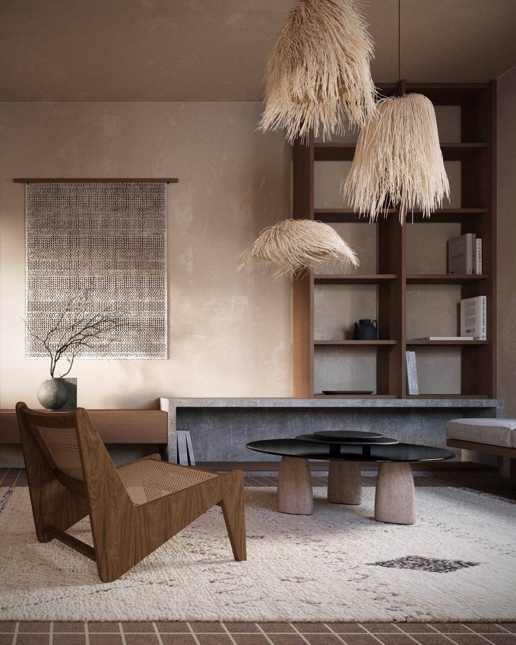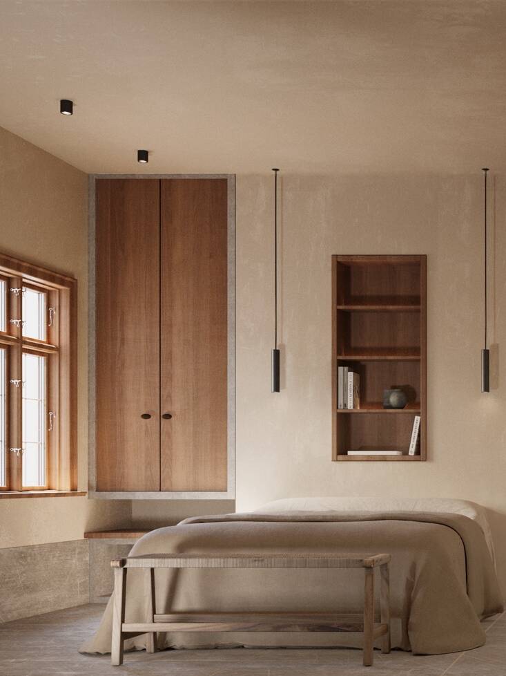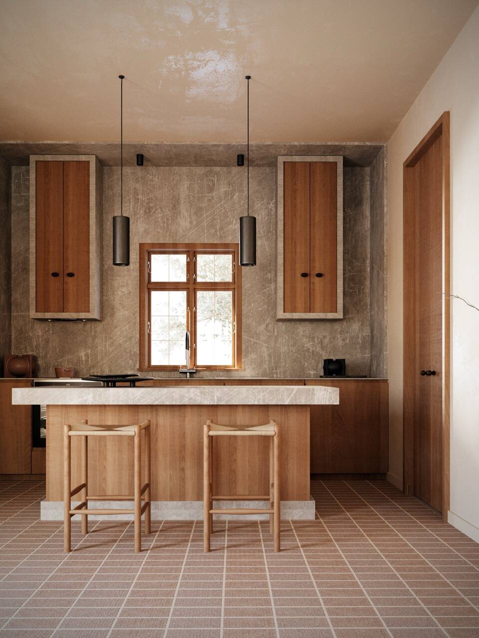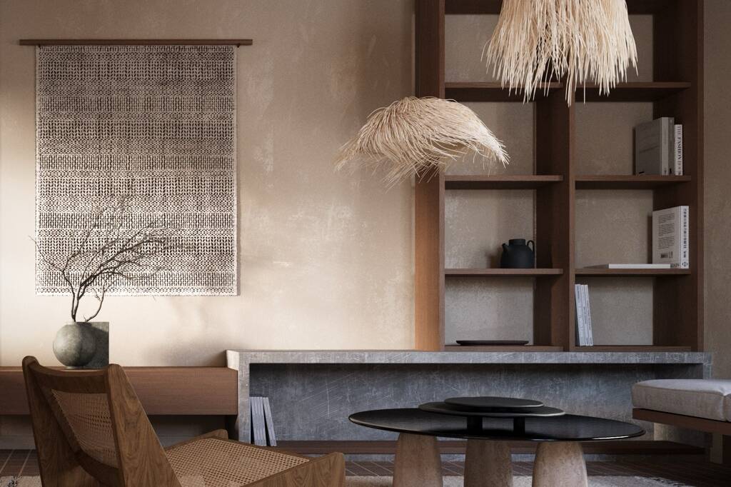 Walls are finished in hand-troweled plaster, creating a soft, organic envelope. Built-in elements such as benches, shelving, and cabinetry are seamlessly integrated into the architecture, allowing materials like natural oak, stone, and woven fiber to become central characters in the narrative. The kitchen features a sculptural island of stone and timber, surrounded by custom cabinetry with clean lines and subtle craftsmanship.