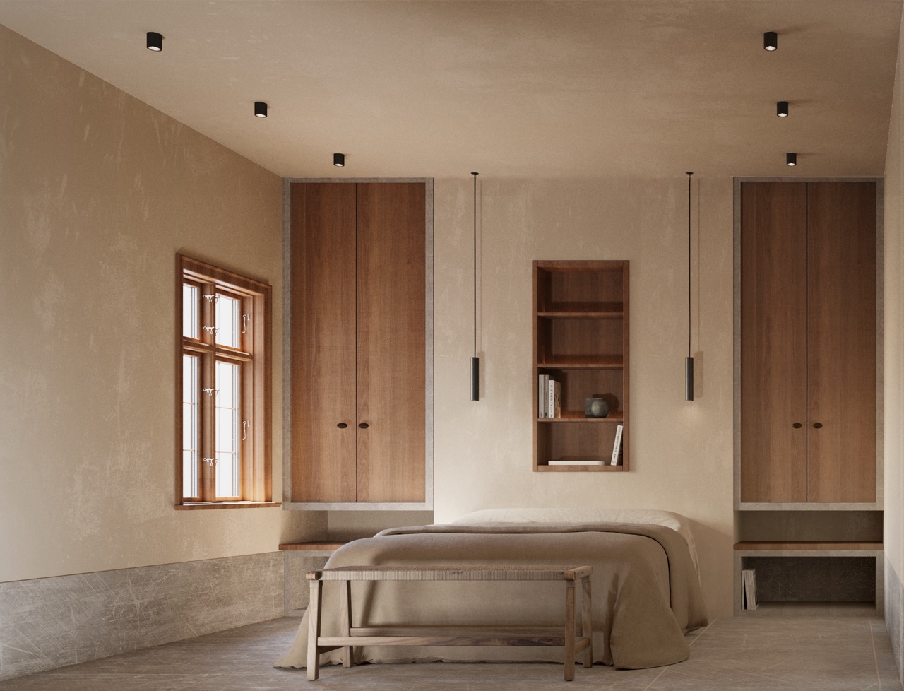 An intimate interior that reflects the tones and textures of the Cycladic landscape. Terra Apartment redefines compact living with its sculpted, minimal atmosphere and warm material palette. Earthy surfaces, handcrafted elements, and carefully curated lighting form a tranquil domestic setting, rooted in restraint and elegance.
